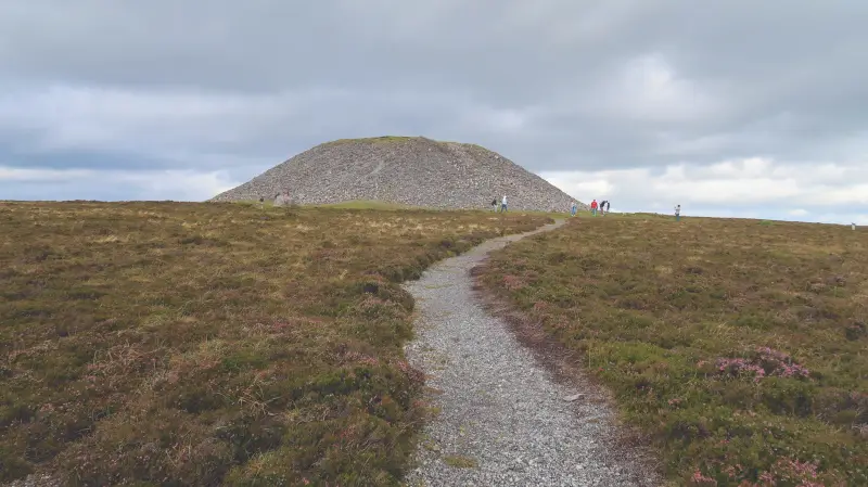 Yeats verwijst naar Queen Maeve, die volgens de legende in de graftombe boven op de berg ligt begraven. Zij zou rechtopstaand zijn begraven met een speer in de hand, zodat zij ook na haar dood haar vijanden kan blijven aankijken. De klim naar de top is behoorlijk steil, maar onderweg kom je genoeg informatieborden tegen die een goed excuus vormen om even uit te rusten. Bovendien is het uitzicht onderweg schitterend. Dit is wat veel mensen zich voorstellen bij Ierland: bergen, zee en een lappendeken van groene velden. Bovenop de berg ligt een gigantische berg stenen. Dit is de graftombe van Queen Maeve.